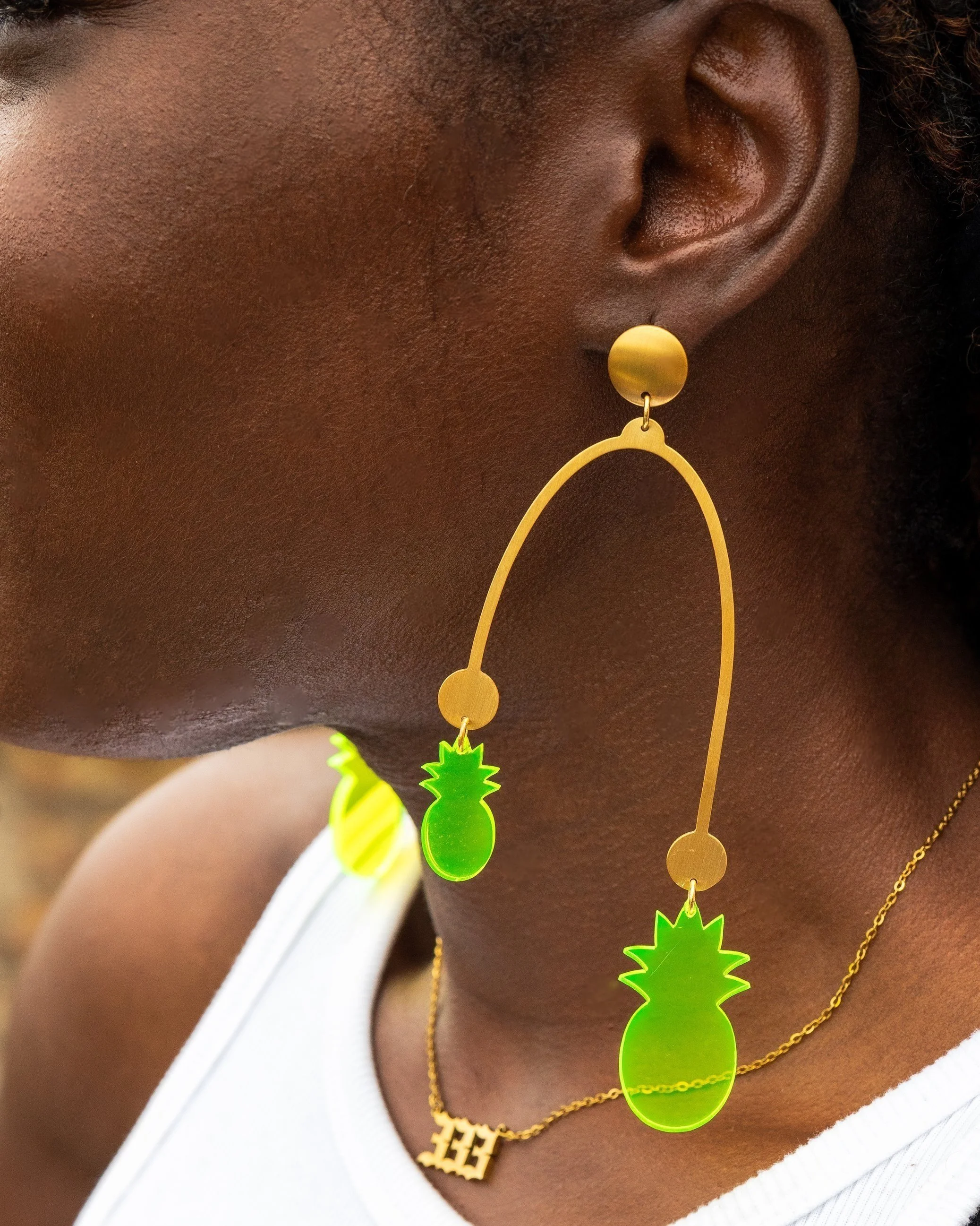 Jumbo pineapple shaped gold-plated stainless-steel quality acrylic earrings. Blue. Pink Mirror, Neon, and Gold